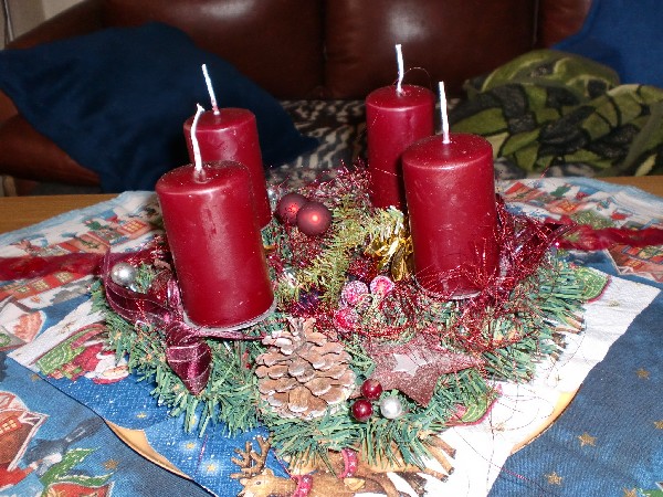 Die Kerzen kann man in verschiedenen Größen kaufen, so daß am 4. Advent alle Kerzen gleich hoch sind.